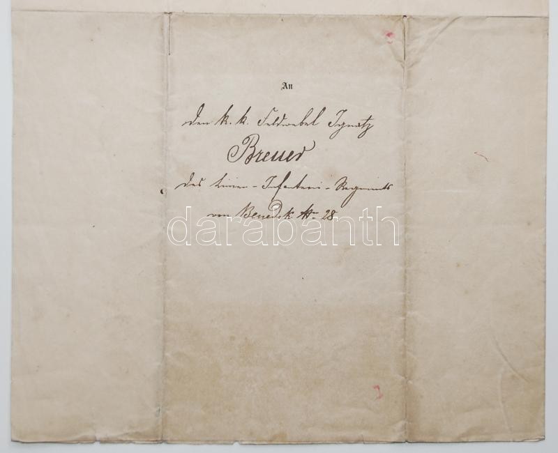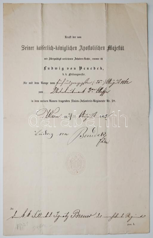 1862 Alhadnagyi kinevezés Brenner Ignác részére Benedek Lajos táborszernagy, Magyarország főkormányzójának saját kezű aláírásával. / Appointment for vice-leutnant with autograph signature of Luis Benedek.