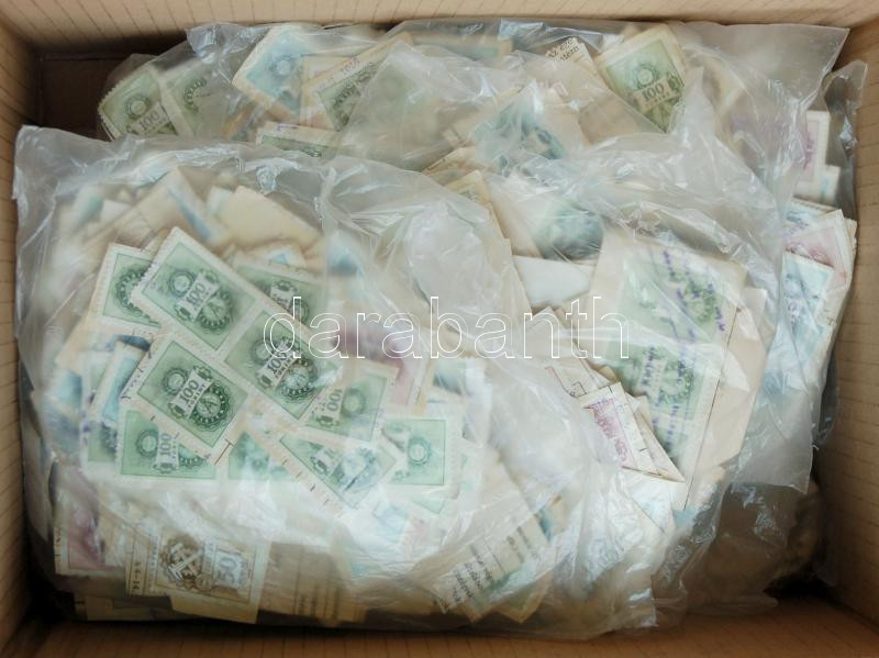 Leírás: 1,20 kg okmánybélyeg kivágás, többféle címlettel az 1960-as évekből, dobozban