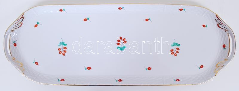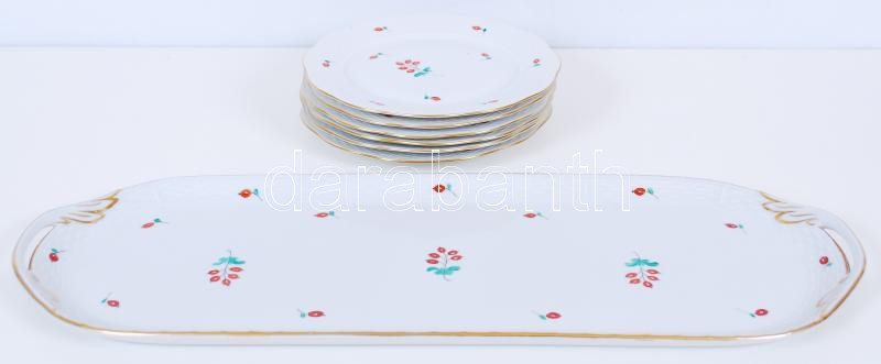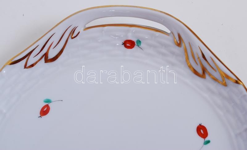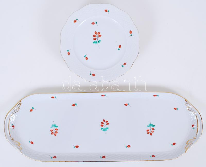 Leírás: Herendi csipkebogyó mintás süteményes készlet, kézzel festett, jelzett, hibátlan, tányérok d:19 cm, füles süteményes tál: 49×17 cm