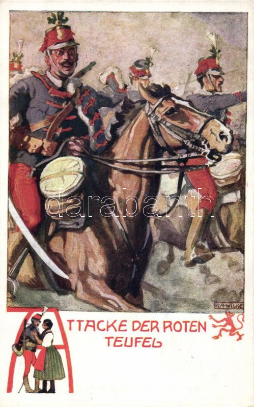 'Red devils attack' Hungarian hussars s: K.A. Wilke https://www.darabanth.com/hu/177-Gyorsarveres/177.0/Kepeslapok/Katonai~3300092/Red-devils-attack-Hungarian-hussars-s-KA-Wilke~II621176
