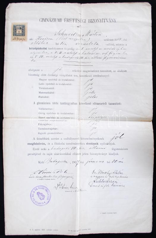 Leírás: 1907 Gimnáziumi bizonyítvány Sweitzer Márton izraelita tanuló részére