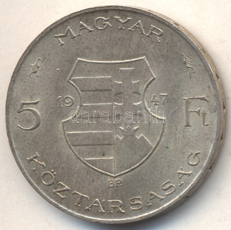 1947. 5Ft Ag "Kossuth" T:2 https://www.darabanth.com/hu/178-Gyorsarveres/178.0/Numizmatika/Magyar-fem-es-ezustpenzek~600145/1947-5Ft-Ag-Kossuth-T2~II625158