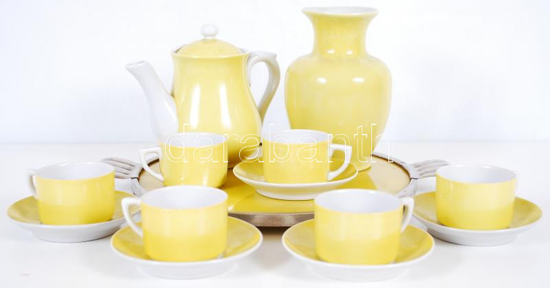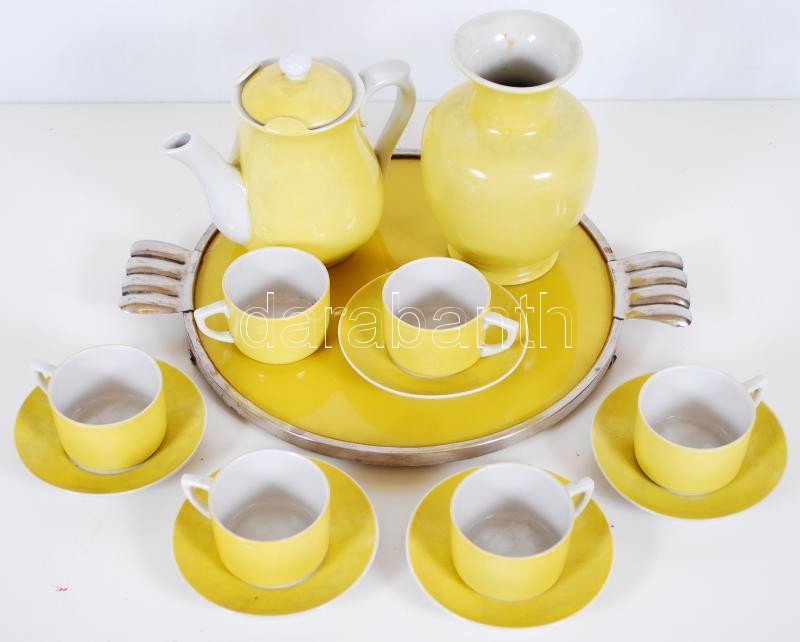 Leírás: Cca 1920 Zsolnay hiányos kávés készlet plusz váza és egy fém tálca. A készlet jelzett, hibátlan, a cukortartó és egy csészealj hiányzik.