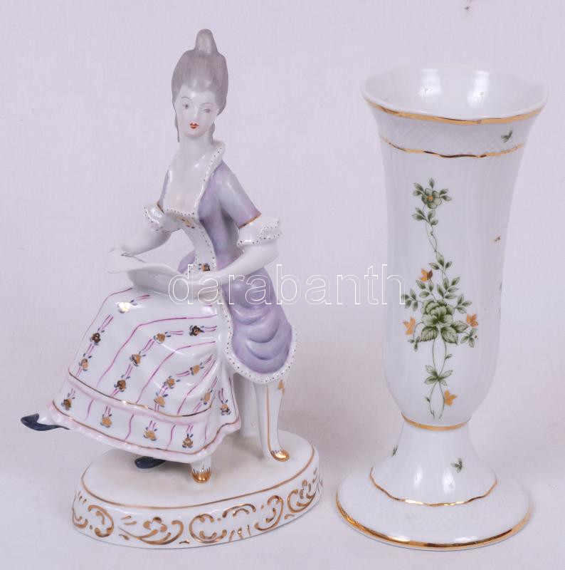 Leírás: Hollóházi kis tétel: Kottát olvasó udvar hölgy, virágos váza, jelzettek, hibátlanok, m:21,23 cm/
