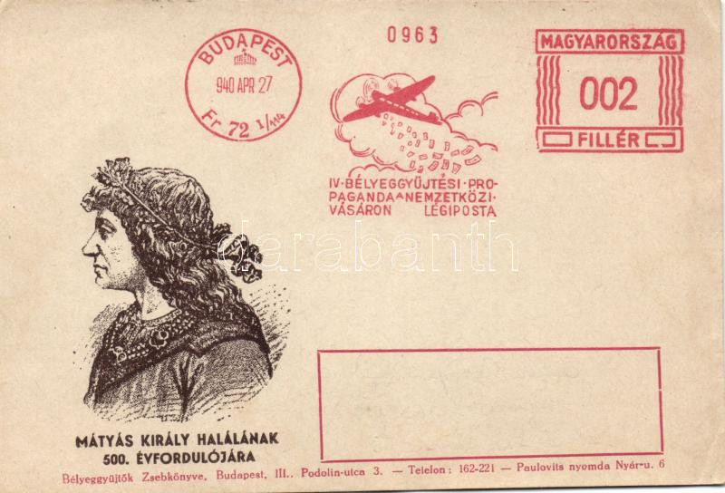 IV. Bélyeggyűjtési propaganda a Nemzetközi Vásáron, légiposta, 1940, Mátyás király, Ga (EB) / IV. propaganda of the stamp collecting, International Market, airmail, 1940, Matthias Corvinus, Ga (EB)