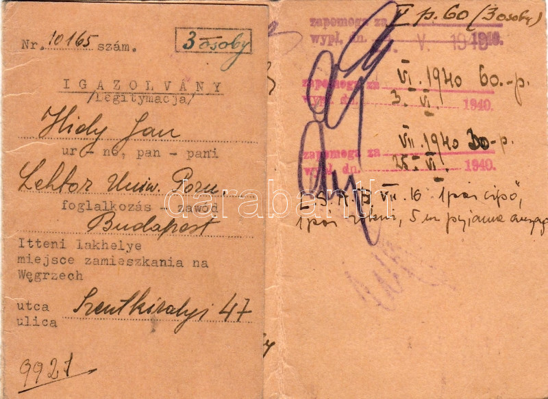 1939 Lengyel menekülteket gondozó iroda igazolványa https://www.darabanth.com/hu/18-Gyorsarveres/18.0/Festmeny-mutargy-papirregiseg-egyeb/Igazolvanyok~210/1939-Lengyel-menekulteket-gondozo-iroda-igazolvanya~II32473