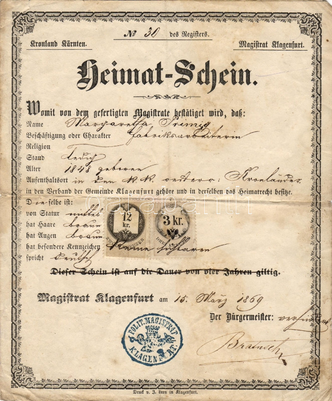 Ausztria 1869. Tartozkodási engedély 2 okmánybélyeggel, Klagenfurt https://www.darabanth.com/hu/18-Gyorsarveres/18.0/Festmeny-mutargy-papirregiseg-egyeb/Igazolvanyok~210/Ausztria-1869-Tartozkodasi-engedely-2-okmanybelyeggel-Klagenfurt~II32411