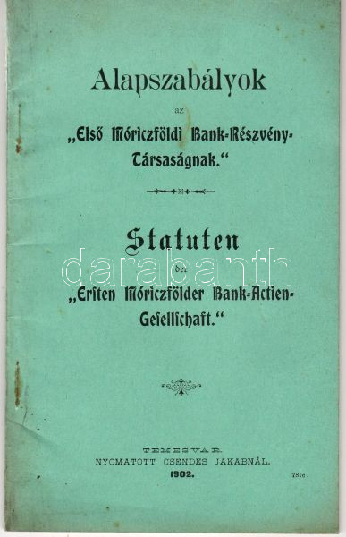 1902 Alapszabályok az Első Móriczföldi Bank Részvénytársaságnak. Temes... https://www.darabanth.com/hu/18-Gyorsarveres/18.0/Festmeny-mutargy-papirregiseg-egyeb/Nyomtatvanyok~219/1902-Alapszabalyok-az-Elso-Moriczfoldi-Bank-Reszvenytarsasagnak-Temesvar-Nyomatott-Csende~II31912