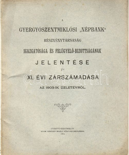 Leírás: 1904 A gyergyószentmiklósi Népbank Rt. jelentése és zárszámadása az 1903-as üzletévről; Sándory Mihály nyomdája