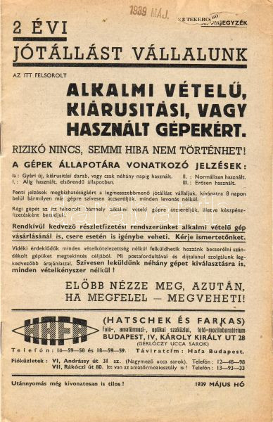 1939 Fényképezőgép és alkatrész árjegyzék https://www.darabanth.com/hu/18-Gyorsarveres/18.0/Festmeny-mutargy-papirregiseg-egyeb/Nyomtatvanyok~219/1939-Fenykepezogep-es-alkatresz-arjegyzek~II32578