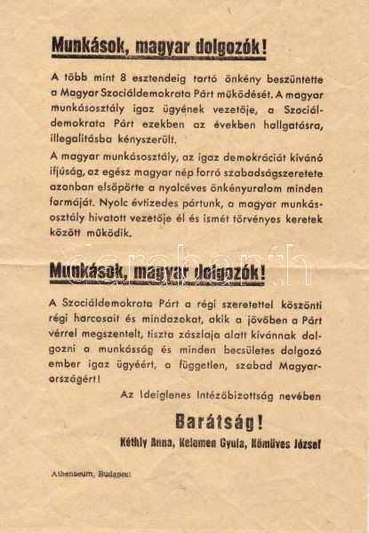 1956 A Magyar Szociáldemokrata Párt röplapja https://www.darabanth.com/hu/18-Gyorsarveres/18.0/Festmeny-mutargy-papirregiseg-egyeb/Nyomtatvanyok~219/1956-A-Magyar-Szocialdemokrata-Part-roplapja~II32433