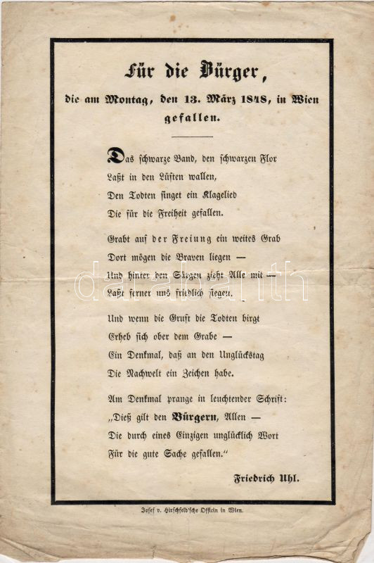 Friedrich Uhl verse az 1848 márc. 13.-i bécsi felkelés elesettjeinek e... https://www.darabanth.com/hu/18-Gyorsarveres/18.0/Festmeny-mutargy-papirregiseg-egyeb/Nyomtatvanyok~219/Friedrich-Uhl-verse-az-1848-marc-13-i-becsi-felkeles-elesettjeinek-emlekere-nemet-nyelvu~II32992
