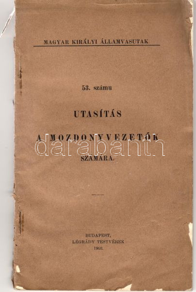 Magyar Királyi Államvasutak Utasítás a mozdonyvezetők számára 1903 Lég... https://www.darabanth.com/hu/18-Gyorsarveres/18.0/Festmeny-mutargy-papirregiseg-egyeb/Nyomtatvanyok~219/Magyar-Kiralyi-Allamvasutak-Utasitas-a-mozdonyvezetok-szamara-1903-Legrady-Testverek~II32159