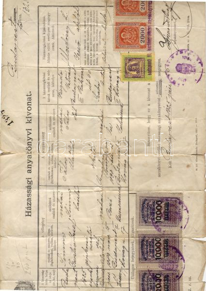Leírás: 1925 Házasságlevél okmánybélyeggel + 5db Budapest városi okmánybélyeggel (szakadozott)