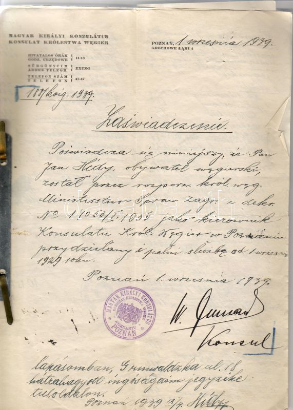 Leírás: 1930 A poznani magyar konzullal kapcsolatos 17 db irat