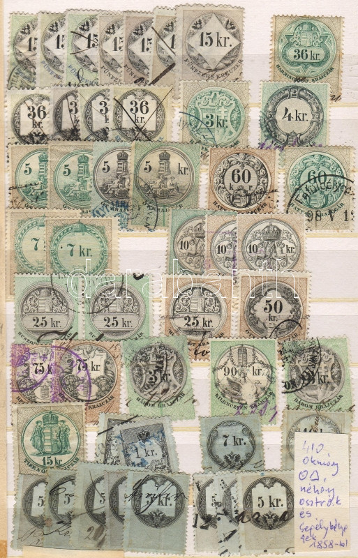 Leírás: 410 db redezetlen okmánybélyeg berakóban 1858-1920, benne szín-, papír- és fogazatváltozatok, néhány osztrák és segélybélyegek
