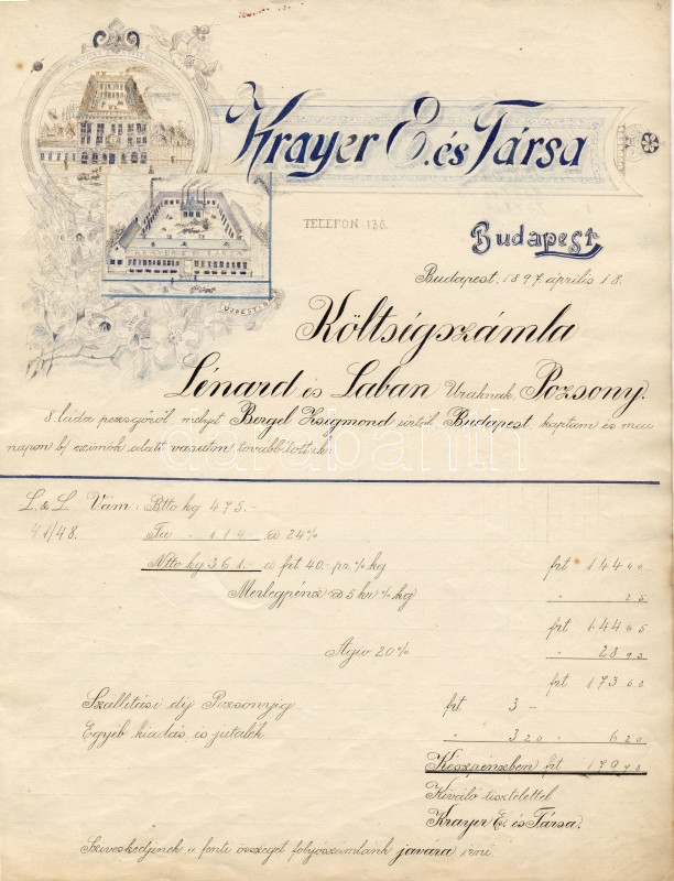 Leírás: 1897 Krayer és Társa pezsgőgyár kézzel rajzolt dekoratív számlaterve