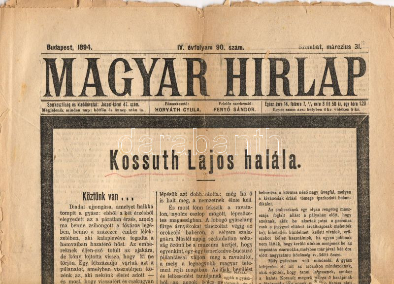Leírás: A Magyar Hírlap 1894 március 21.-i száma Kossuth Lajos halálhírével (szakadozott)