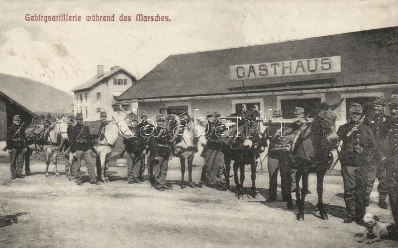 Leírás: Mosko (Trebinje) Gasthaus, Gebirgsartillerie während des Marsches / K.u.K. military, alpine unit; restaurant