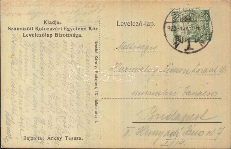 Leírás: Kolozsvár 'Lesz még kikelet Kolozsvár felett'; kiadja a Száműzött Kolozsvári Egyetemi Kör levelezőlap bizottsága / irredenta s: Árkay Tessza