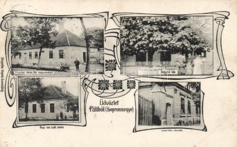 Leírás: Páli, Drescher-féle nagyvendéglő, katolikus iskola, jegyzőlak, Varró ház; Art Nouveau, kiadja Drescher János