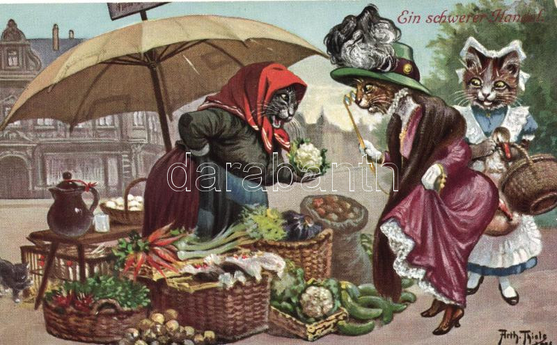 Cat market, Theo. Stroefer, Nürnberg Serie 1077. s: Arthur Thiele https://www.darabanth.com/hu/18-Nagyaukcio/18.1/Motivum-kepeslapok/Macska~6254/Cat-market-Theo-Stroefer-Nurnberg-Serie-1077-s-Arthur-Thiele~II838274