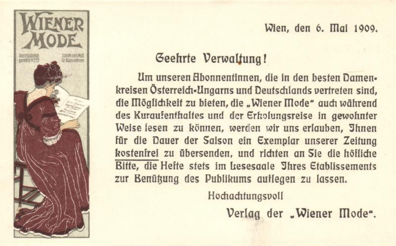 'Wiener Mode' Art Nouveau fashion magazine advertisement litho https://www.darabanth.com/hu/18-Nagyaukcio/18.1/Motivum-kepeslapok/Reklam~6187/Wiener-Mode-Art-Nouveau-fashion-magazine-advertisement-litho~II831834
