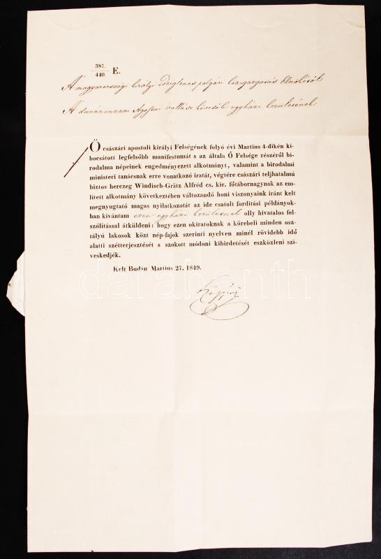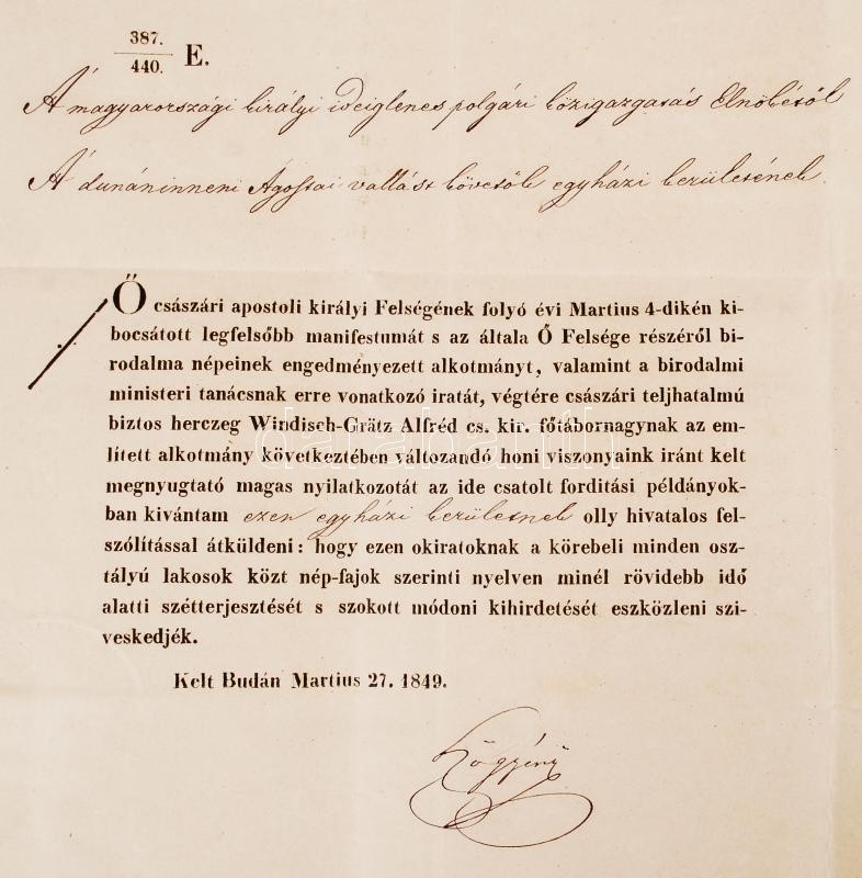 1848 03. 27. Id. Szőgyény-Marich László (1806-1893) a magyarországi polgári közigazgatás elnökének levele az új császári alkotmányra kihirdetésére vonatkozóan