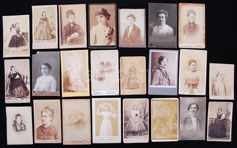 Leírás: 1880-1930 21db keményhátú fotó hölgyekről, különféle műtermekből, vizitkártya méretben /