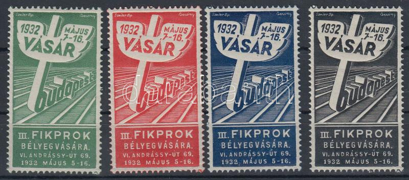 Leírás: 1932 Budapesti Vásár III. FIKPROK bélyegvására, levélzáró sor (4 klf színben)
