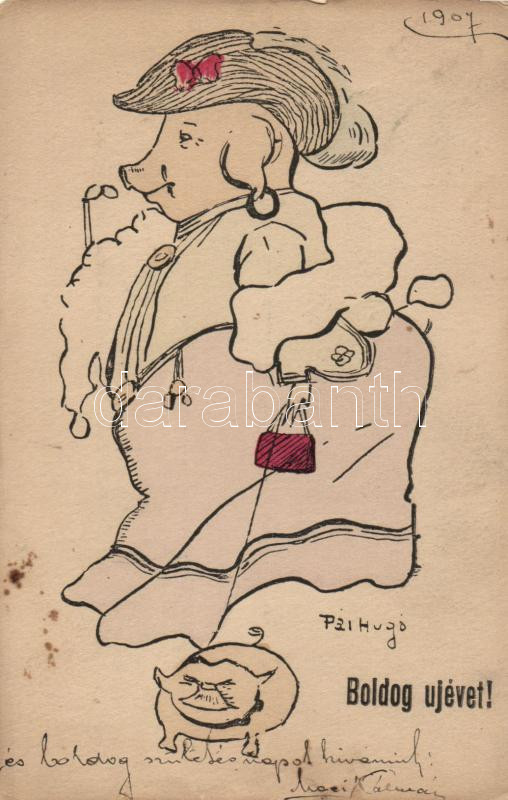 New Year, pig lady, s: Pál Hugó https://www.darabanth.com/hu/180-Gyorsarveres/180.0/Kepeslapok/Udvozlolap~800094/New-Year-pig-lady-s-Pal-Hugo~II638742