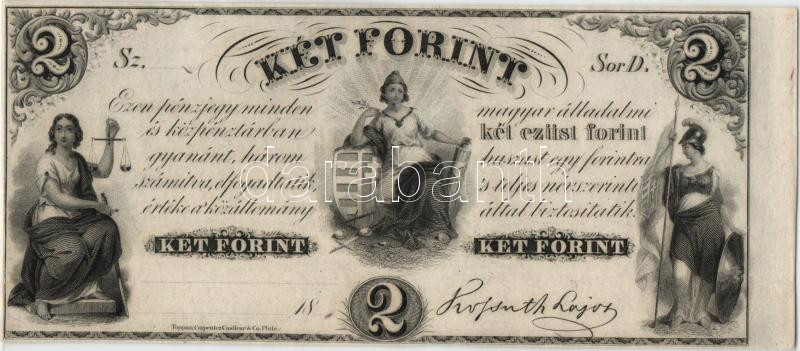 Leírás: 1852. Emigrációs "Kossuth bankó" 2Ft keltezés nélkül "D" jobb ívszéllel T:I