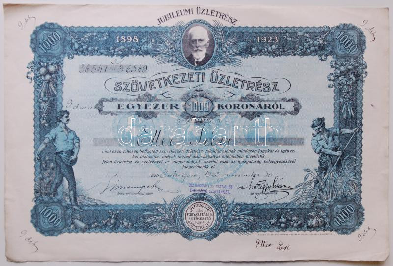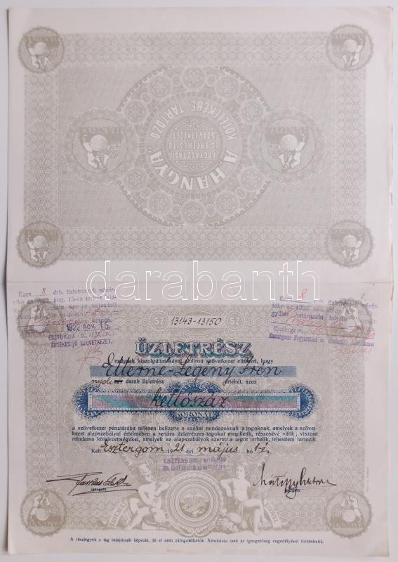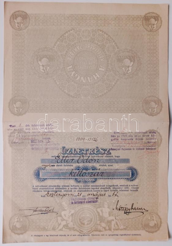 Esztergom 1921. "Esztergomi Fogyasztási és Értékesítő Szövetkezet" Üzl... https://www.darabanth.com/hu/180-Gyorsarveres/180.0/Numizmatika/Reszvenyek-es-sorsjegyek~200005/Esztergom-1921-Esztergomi-Fogyasztasi-es-Ertekesito-Szovetkezet-Uzletresz-200K-rol-szel~II615993