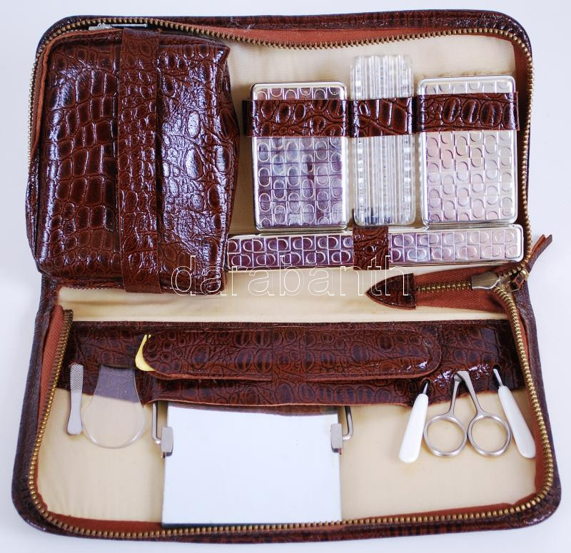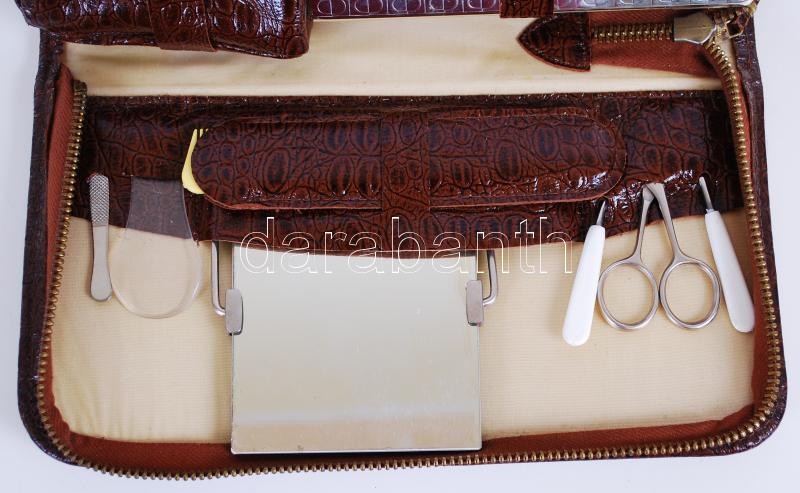 Leírás: Cca 1960 pipere készlet műbőr tokban, hiánytalan, 28×15 cm