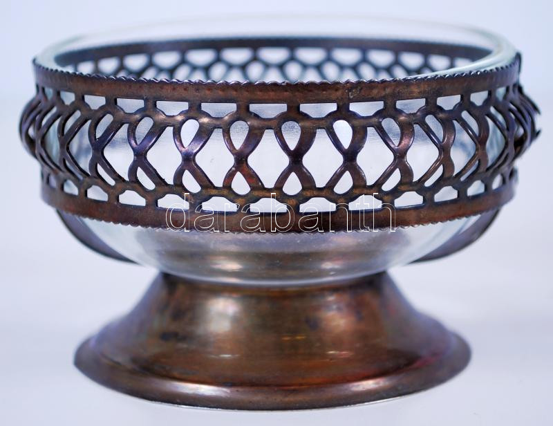 Leírás: Kínáló kosár, alpakka hibátlan üveg betéttel, jelzett, m: 6 cm, d:10 cm / Alpaca with glass, basket from England