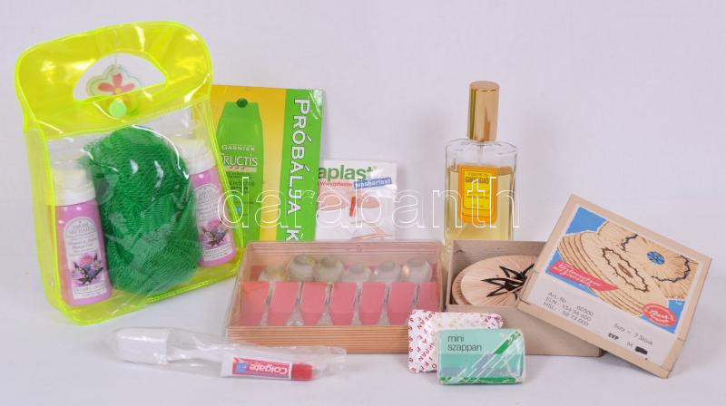 Leírás: Kis bolhatétel retró pipereszerekkel (női parfüm, szappan, fogápolószett, stb.), kiskanálkészlet