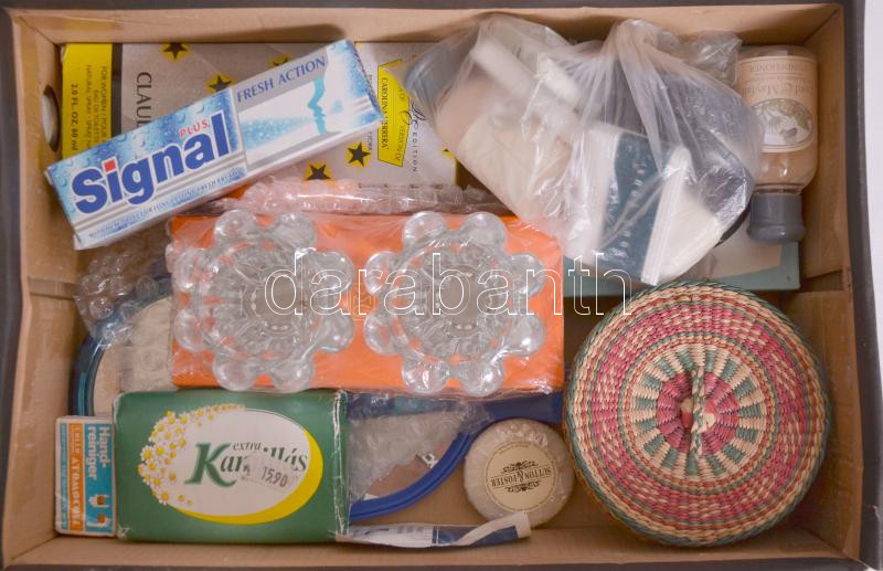 Leírás: Kis bolhatétel retró pipereszerekkel, szappangyűjteménnyel, kézi tükrökkel, mécsestartóval, női parfümmel