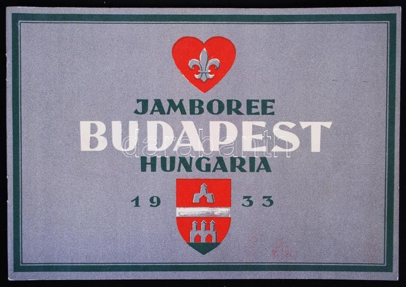 1933 Jamboree Budapest Hungaria 16 oldalas emlékfüzet a külföldi résztvevőknek Márton és Richter grafikákkal. Belső oldalán a táborparancsnokság tudakozó iroda tagjainak dedikálásával. Hátul kis sérülés /