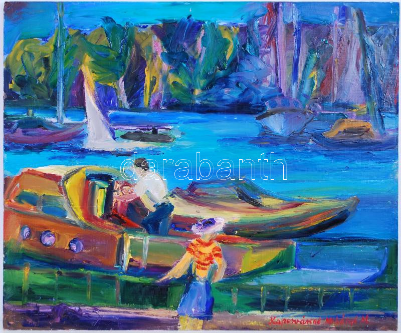 Leírás: Kaposváriné Mihályi Mária: Indul a hajó. Olaj, farost, jelzett, 50×60 cm