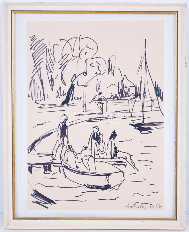 Leírás: Kováts Nagy Ira (1921-2008): Csónakázók. Filctoll, papír, jelzett, üvegezett keretben, 32x26cm