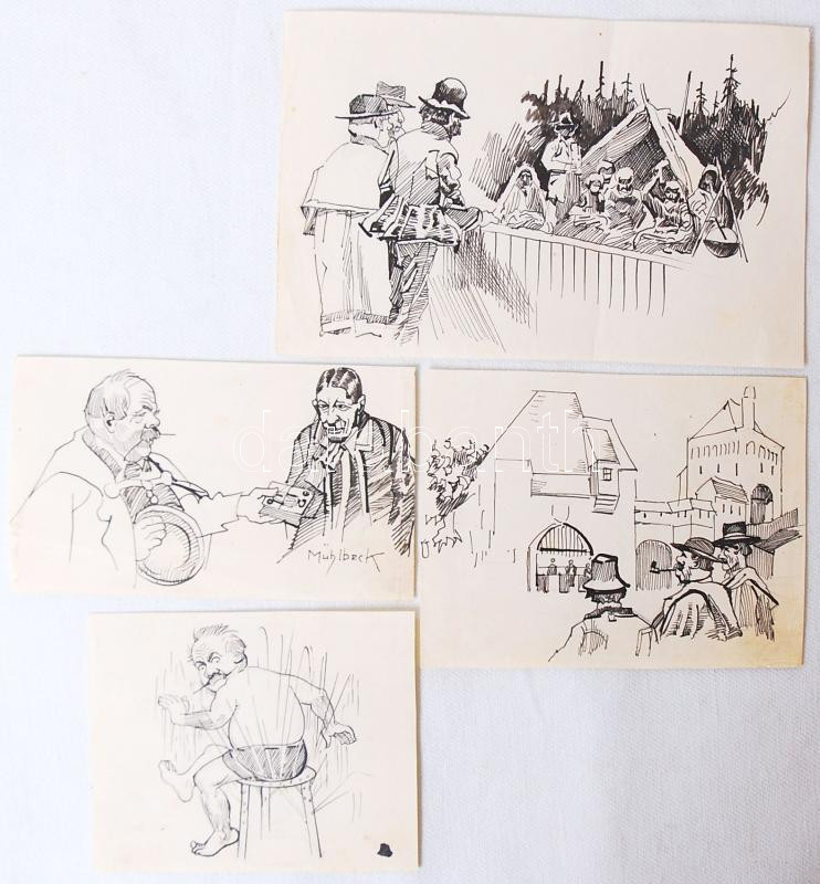 Leírás: Mühlbeck Károly (1869-1943): Illusztrációk 4db Gárdonyi Géza: Göre Gábor bíró úr sorozatából, tus, papír, jelzett 1db, (4)× 10×8 cm
