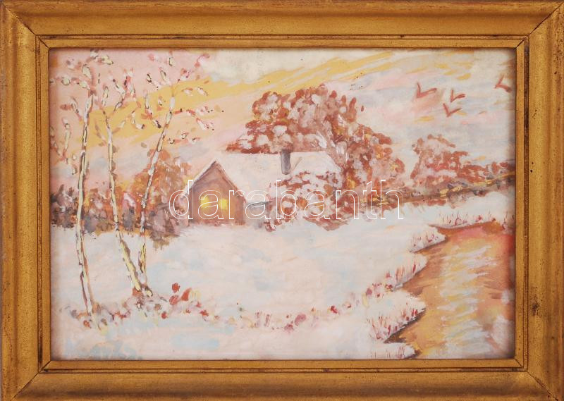 Leírás: Nagy Zs. jelzéssel: Kis ház téli naplementében. Tempera, papír, üvegezett keretben, 17x23,5cm