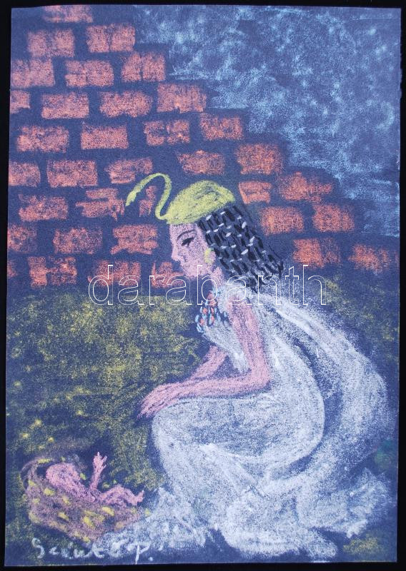Leírás: Olvashatatlan jelzéssel: Mózes és a fáraó lánya. pasztell, papír, 35×24 cm