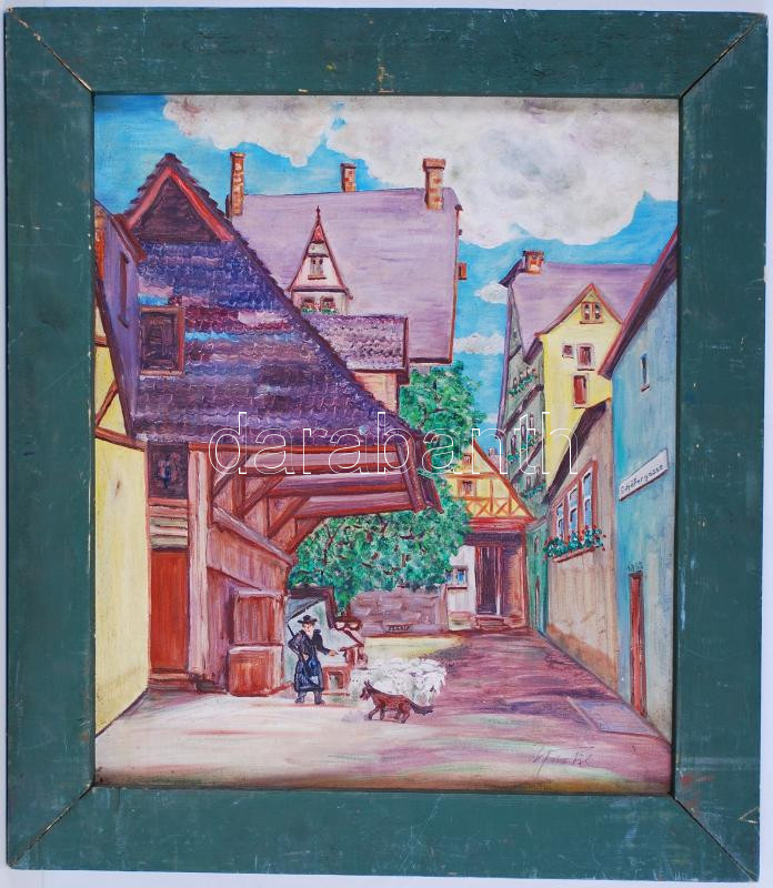Leírás: Olvashatatlan jelzéssel: Utca részlet. Olaj, vászon, keretben 71×62 cm
