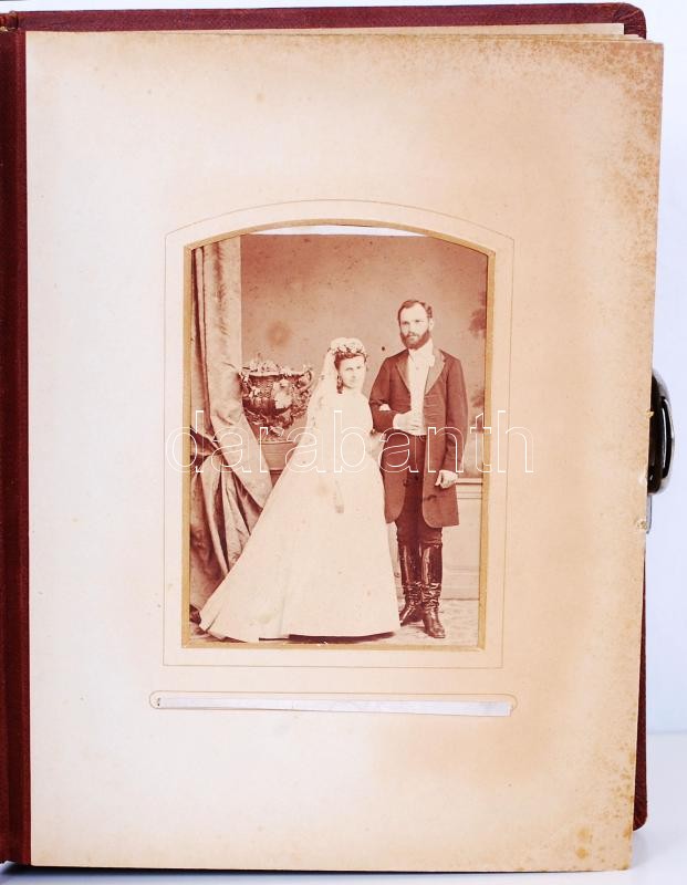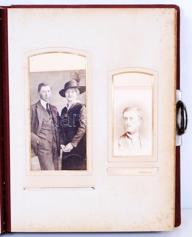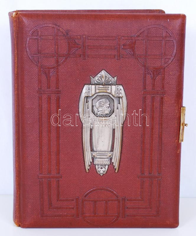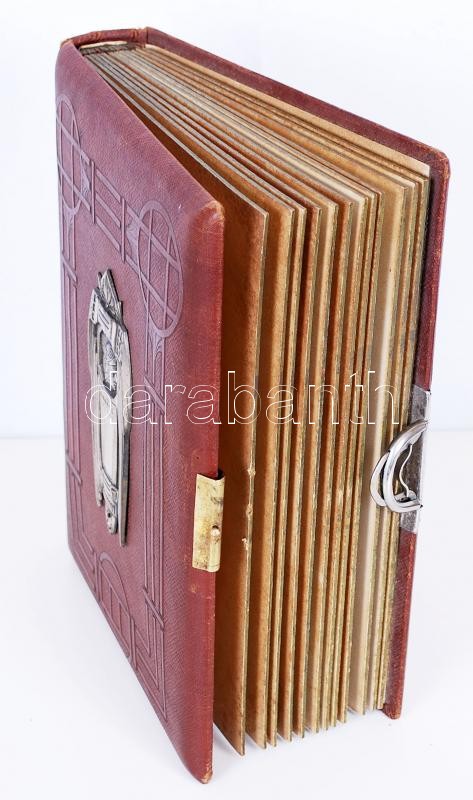 Szecessziós fénykép album tele híres stúdiók családi képeivel, fém relieffel az elején, bőr kötésben, jó állapotban, összesen 62 db fotóval 28×21×5 cm/ Secession foto album