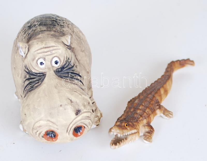 Leírás: Kézzel készített víziló 6×8 cm, jelzett és egy krokodil h:10 cm
