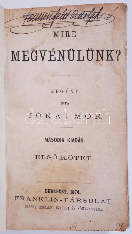 Leírás: Jókai Mór: Mire megvénülünk? Második kiadás. Bp., 1874, Franklin-Társulat. Újrakötve, félvászon kötésben, kissé viseltes állapotban