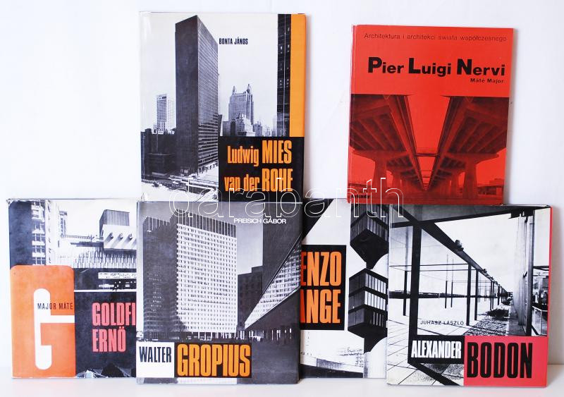 Híres építészekkel foglalkozó könyv tétel: Kenzo Tange. Pier Luigi Nervi.Ludwig Miles van der Rohe.Alexander Bodon. Walter Gropius. Goldfinger Ernő. Összesen: 6 db könyv