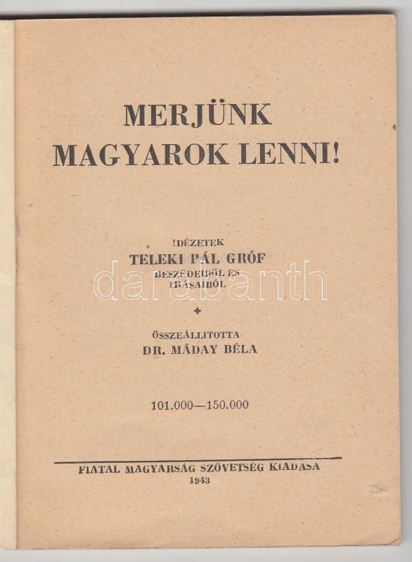 Leírás: Dr Máday Béla: Merjünk magyarok lenni! Idézetek Gróf Teleki Pál beszédeiből és írásaiból. Budapest 1943. Fiatal Magyarság Szövetség Kiadása.