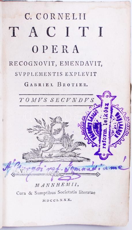 Tacitus, C. Cornelius: Opera. Tomus secundus. Recognovit, emendavit, supplementis explevit Gabriel Brotier. Mannheim, 1730. Societatis literatae 307p. kihajtható leszármazási táblával / with family tree